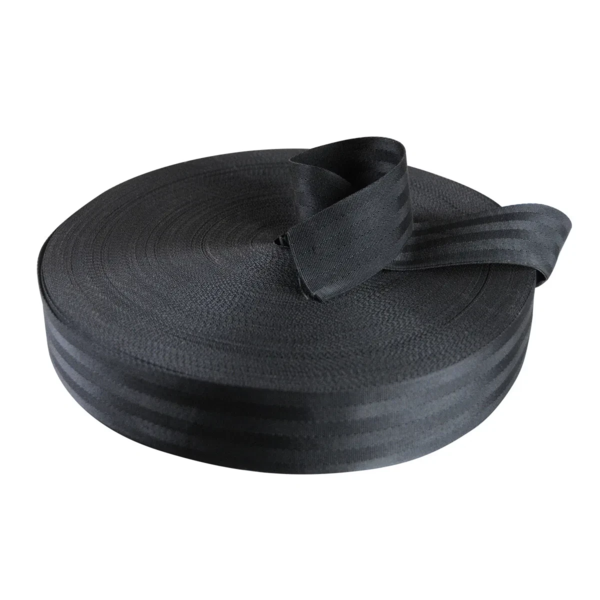 Opbindingsrem af sort sikkerhedssele-materiale leveres i en 100-meters rulle og er fremstillet af UV-behandlet polypropylen, hvilket sikrer lang holdbarhed og beskyttelse mod solens påvirkning.